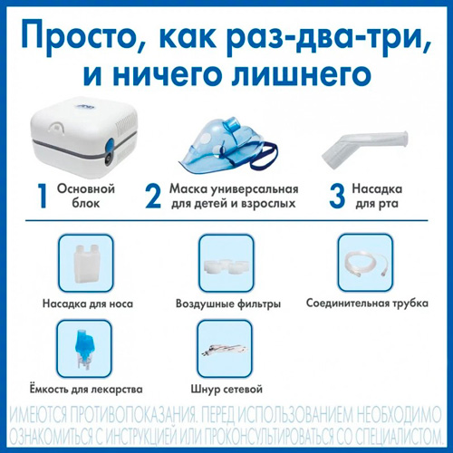- Универсальная маска и набор для ингаляций позволяет использовать прибор всей семье.