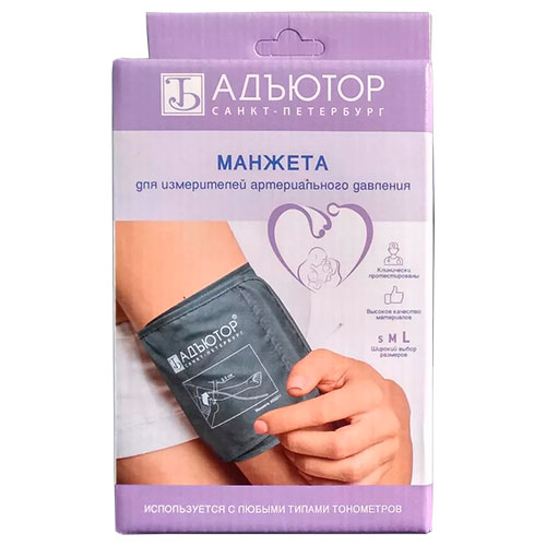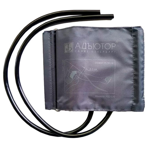 Манжета взрослая плечевая среднего размера с пневмокамерой из латекса с двумя трубками с кольцом. На манжету нанесены специальные размерные метки для удобства ее использования.