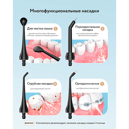 Сопло поворачивается вокруг своей оси, что существенно улучшает качество очищения ротовой полости и промежутков между зубами.